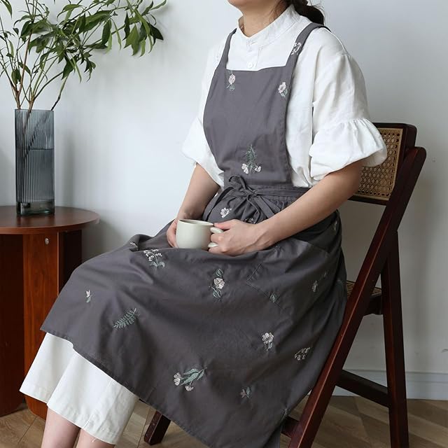 Ifukens エプロン レディース おしゃれ 北欧エプロン 可愛い 大人用 エプロン かわいい刺繍花柄ワンピース防水エプロン h型ポケット付き 厚手のコットンオシャレエプロン 御洒落作業用エプロン 大きいサイズ アフタヌーンティー エプロンドレスカフェ エプロン キッチン 花屋 料理教室(グレー) | SMILE