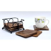 完全ハンドメイド マンゴーウッドティーコースター エンボス花柄 錬鉄ホルダー/スタンド付き