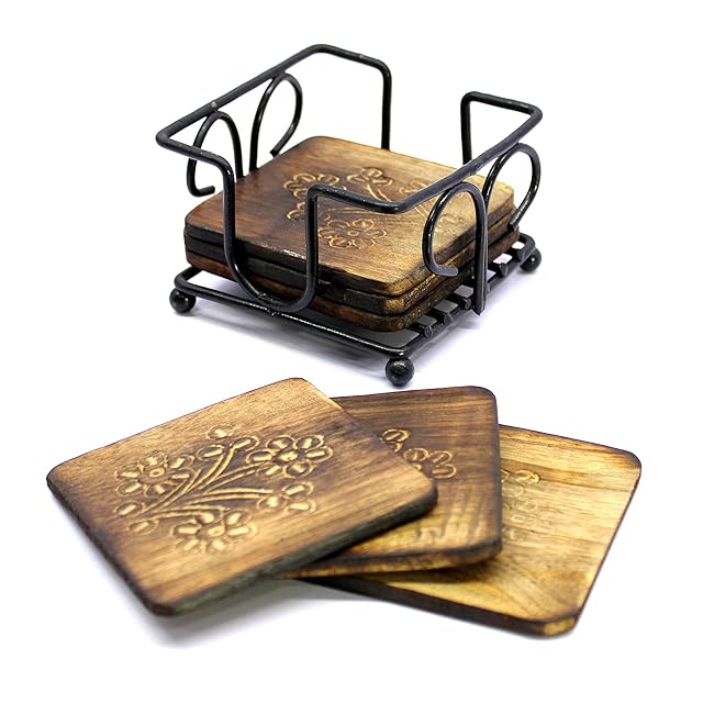 StonKraft-木製ティーコーヒーコースター/錬鉄ホルダー付きの素朴なヴィンテージ風コースターセット(wooden tea coffee coasters)