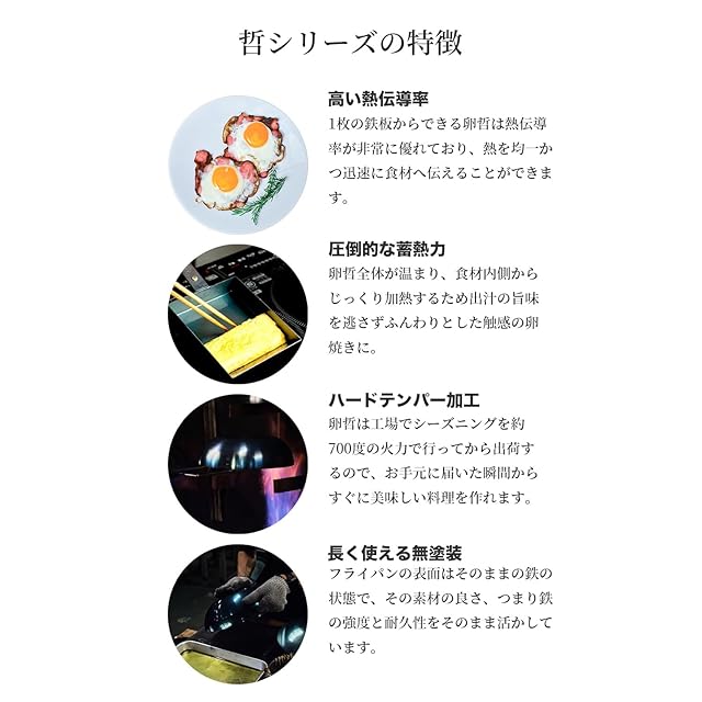 【商品への想い】 食事を通じた人々の幸せを追求する一環として、卵哲を生み出しました。 これは、誰もが気軽に扱え、毎日の食事作りを楽しくするという目指した商品です。 卵哲はハイクオリティな鉄製卵焼き器でありながら、その軽さと手頃な価格が特徴です。 使い勝手を重視した形状と薄さは、調理時間の短縮にもつながります。 また、表面に施したハードテンパー加工により、一般的な鉄製卵焼き器に必要なシーズニングが不要で、手入れが簡単です。 そして、無塗装なので、一生モノとして長くお使いいただけます。 また、鉄製卵焼き器を使うことで自然に鉄分を補給できるという健康面でのメリットも大きな特徴となっています。