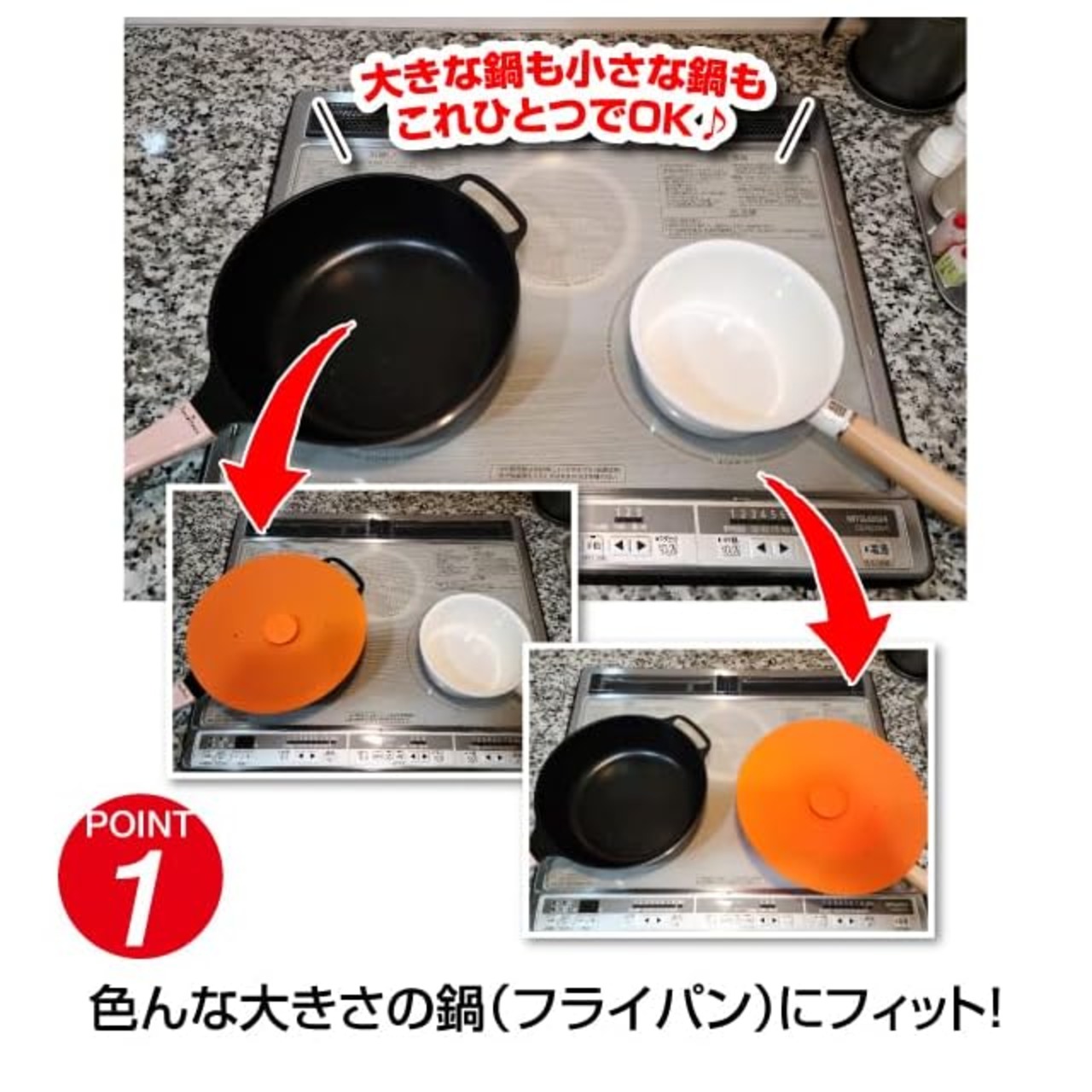 【2つの便理な使用方法】 ・鍋の取っ手が邪魔にならなければ、そのまま乗せるだけでフィットします。 ・取っ手が邪魔になる場合はフタの中央を押して反らして使用して下さい。