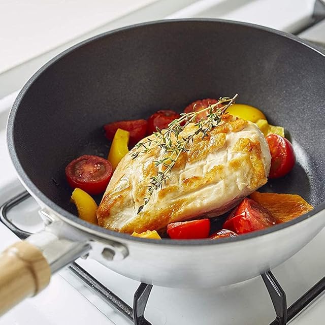 素材・材質:本体/アルミニウ合金 底面/鉄・アルミニウム溶射(はり底) 内面/ふっ素樹脂塗膜加工 外面/ヘアライン(サテン)仕上げ ハンドル/木材(ホワイトアッシュ) ツマミ/木材(ホワイトアッシュ) ガラス蓋本体/ソーダ石灰ガラス ガラス蓋リング/ステンレス鋼 ガラス蓋ツマミ/木材(ホワイトアッシュ)