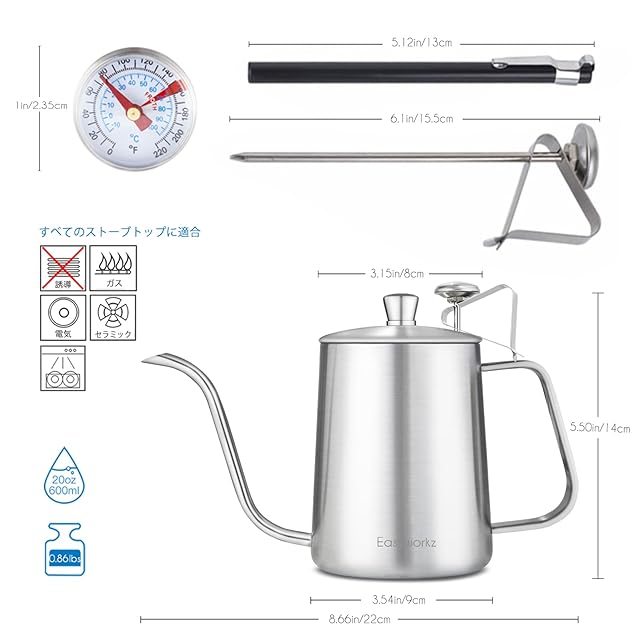 優れたデザイン:人間工学に基づいた耳の形のハンドルは、沸騰したお湯を注いで火傷をしないように快適で安全なグリップを実現するように設計されています。コンパクトなサイズで掃除が簡単です。ケトル蓋一体型温度計により、最適な温度でコーヒーを淹れることができます。