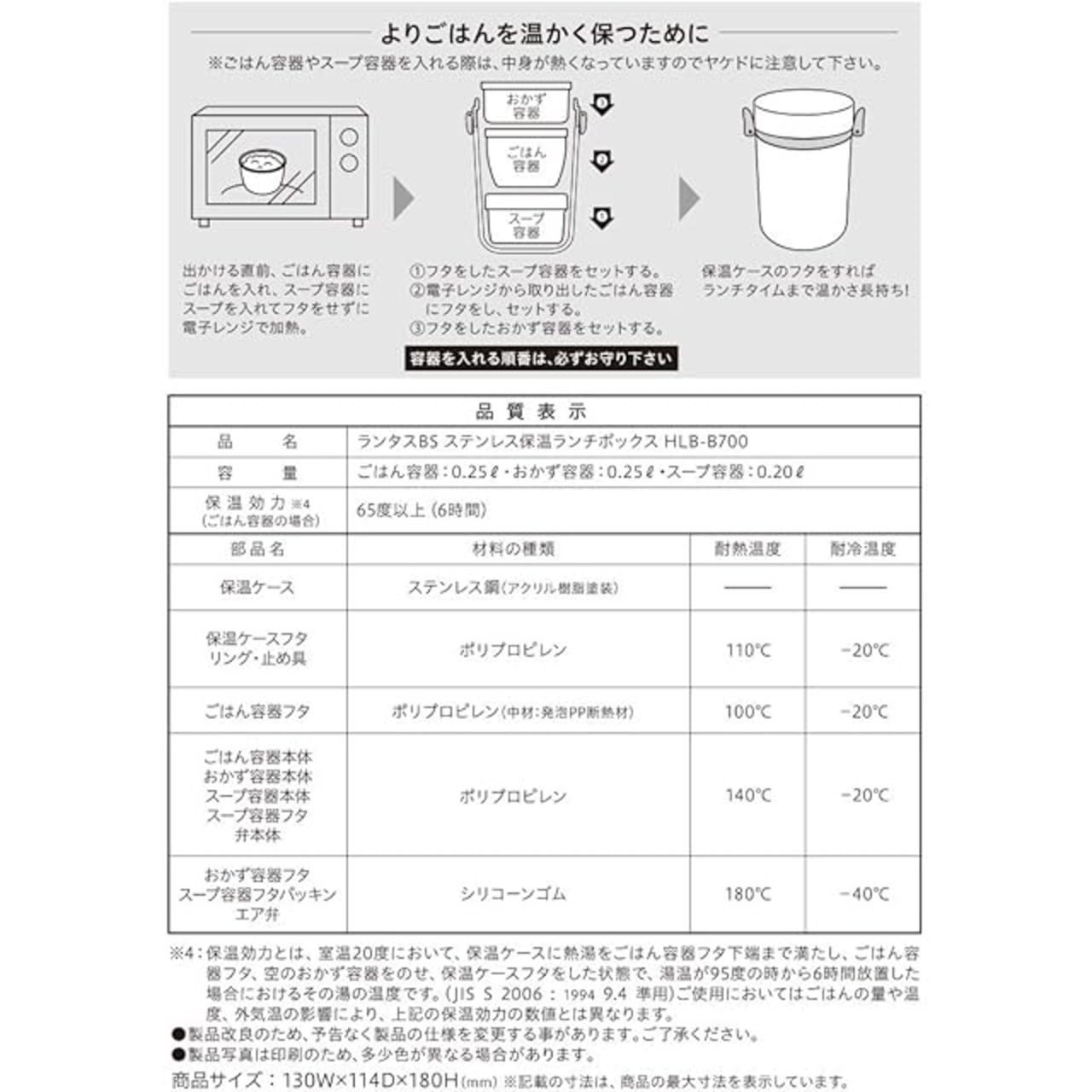 材質:保温ケース/ステンレス鋼(アクリル樹脂塗装)、ご飯容器フタ/PP(中材:発泡PP断熱材)、保湿ケースフタ・リング・止め具・ご飯容器本体・おかず容器本体・スープ容器本体・スープ容器フタ・弁本体/PP、おかず容器フタ・スープ容器フタパッキン・エア弁/シリコーンゴム