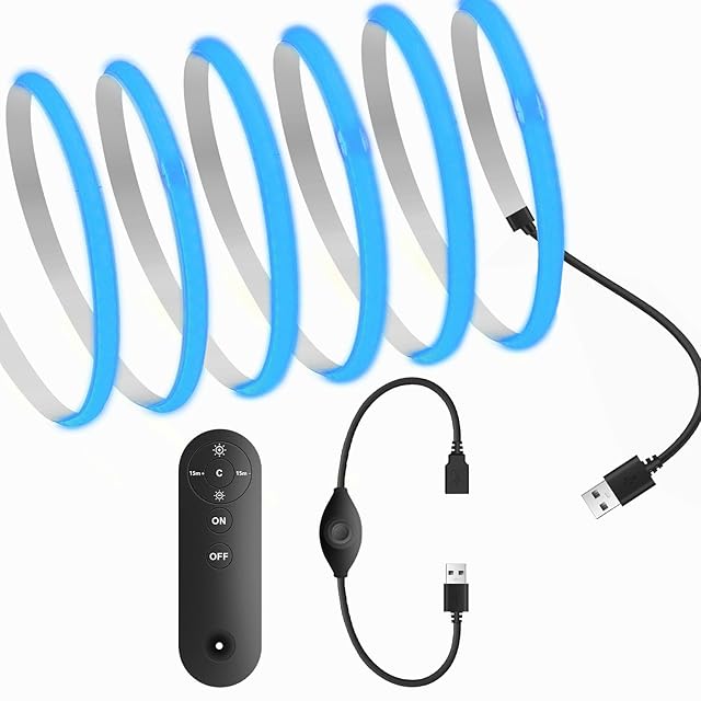 【RYE】 COB テープライトLEDストリップライトフレキシブル 幅5mm 高密度 隠れたLEDテープライト0.5m 320LEDs/m アイスブルー 5V USBコネクター リモコン, 180°発光CRI>=90両面テープ変形可能 切断可能 寝室 キッチンホーム オフィス屋内装飾 (アイスブルー,0.5m) | SMILE