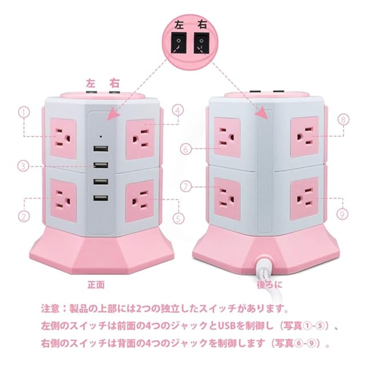 Micshion 電源タップタワー型 コンセント 2つのバイポーラスイッチ AC 8個口 USB 4ポート(4.5A/5V)1500w 入力100v-125v 急速充電可能 雷ガード保護 過負荷保護 延長コード2m 職場用 家庭用 ピンク | SMILE