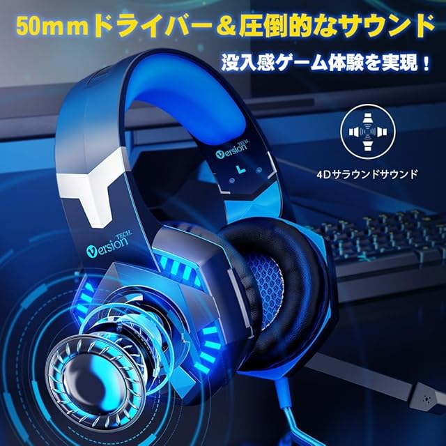 VersionTECH. ゲーミングヘッドセット PS4 ヘッドセット 高精度マイク付き 有線 ヘッドホン 騒音抑制 密閉型 重低音 LEDライト コントローラー ミュート 50mmドライバー USB 3.5mm 軽量 快適 Switch Xbox One PS5 FPS PC対応