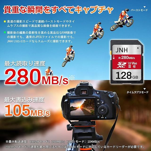 JNH高性能 Extreme Speedシリーズ SDXC UHS-II カード;容量:128GB(ユーザ領域約116GB); 種類:超高速SDXC UHS-II カード ; UHSスピードクラス: U3、SDスピードクラス: C10、Video Speed Class: V60;4K Ultra HD対応;対応フォーマット形式:exFAT。MILカメラやシネマカメラで撮影するプロシューマーやプロフェッショナル向け。ビデオカメラ、一眼レフカメラ、ミラーレスまで様々なタイプのカメラで4K動画の撮影におすすめ。保証:安心の国内サポートとメーカー5年保証