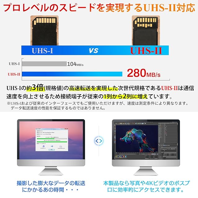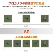 最大転送速度:UHS-II モード:280MB/s;UHS-I モード:104MB/s *パフォーマンスはホスト機器によって異なります。UHS-IIのパフォーマンスを活用するにはUHS-II対応ホストまたはUHS-II対応のリーダーが必要です。 UHS-Iの約3倍(規格値)の高速転送を実現した次世代規格であるUHS-IIは通信速度を向上させるため接続端子が従来の1列から2列に増えています。最大転送速度280MB/sで、写真やビデオファイルの転送時間を短縮できます。ビデオスピードクラスV60でシネマ品質の4K UHDを録画。