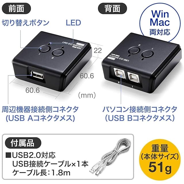 2台のパソコンで1台のUSB機器を共有できるUSB切替器です。ボタン一つで簡単に切り替えることができます。