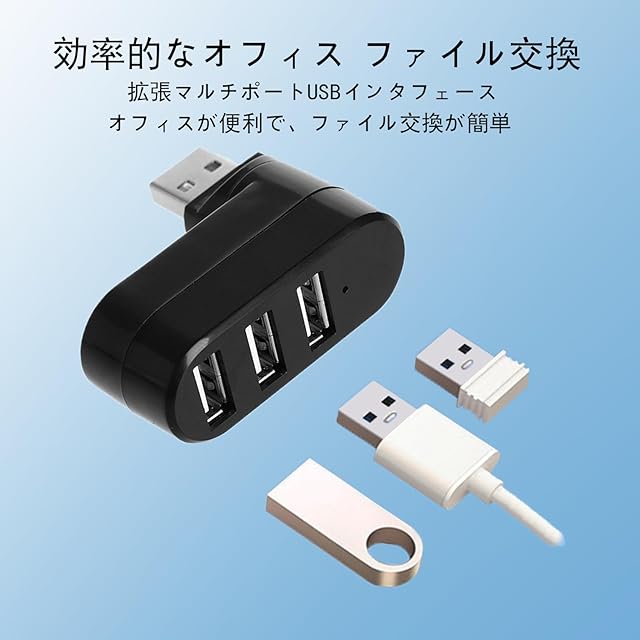 【3つのポート】本製品はUSBメモリ、カードリーダー、USBマウス、スキャナー、デジタルカメラ、デジタルビデオ、USBサウンドカード、ハードディスクボックスなどの設備に適用し、3つのUSBインタフェースを追加した。<br>【回転可能】クラシックな回転設計で、USBハブは90°/180回転可能。ポートの小さいノートパソコンやスイートなどを柔軟に設定できます。<br>【ポート拡張】パソコンやパソコンに適したUSBハブ。駆動不要、プラグアンドプレイ。スタイリッシュな保護カバー、ホットプラグ対応、低消費電力。<br>【多重セキュリティ】インテリジェントな過電圧、過電流、安全保護メカニズムを内蔵し、より安心して使用できます。<br>【直接差し込み式&持ち運びに便利】ケーブル不要でノートパソコンなどに直接差し込むことができます。パソコンを差し込んでも邪魔になりません。コンパクトなデザインでケーブルなし、伸縮性に優れ、机の中に保管したり携帯したりするのに適しています。軽量設計で旅行にぴったりです。