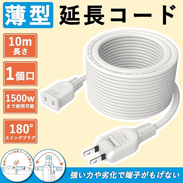 【延長コード仕様】・定格電圧:125V・定格電流:15A・10m長・ソケット口数:1ツ口。(15A/125Vまで、1500Wまで)。プラグ部には抜き差ししやすいくぼみを設けています。発熱を抑えるコンセント。(高電導材採用)、