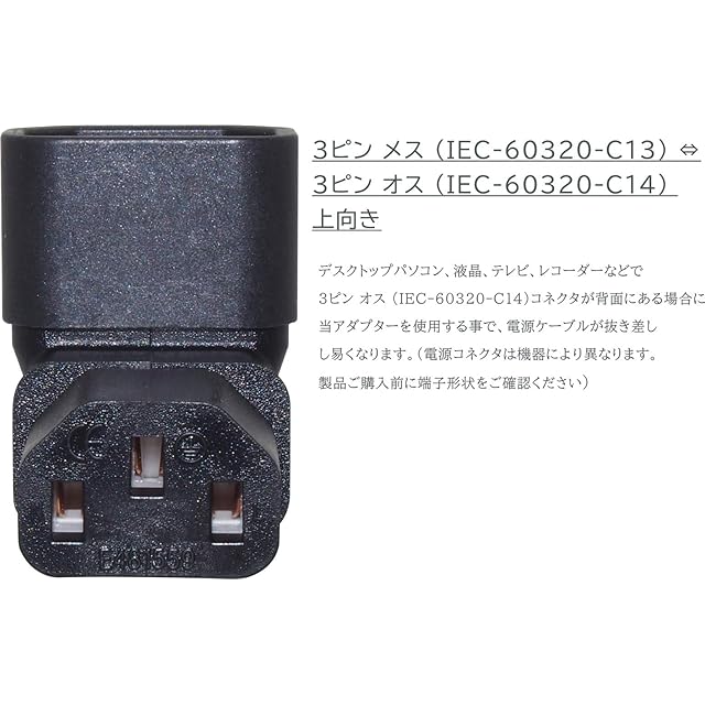 3ピン メス (IEC-60320-C13) ⇔ 3ピン オス (IEC-60320-C14) 上向き<br> デスクトップパソコン、液晶、テレビ、レコーダーなどで3ピン オス (IEC-60320-C14)コネクタが背面にある場合に当アダプターを使用する事で、電源ケーブルが抜き差しし易くなります(電源コネクタは機器により異なります。製品ご購入前に端子形状をご確認ください)<br> ●許容電流 10A ●許容電圧 250V<br> ●製品サイズ 4.6cm × 3.75cm × 2.9cm ●重量 35g<br> ●製品内容 3ピン変換アダプタ × 1 ●保証期間 お届け日より1ヶ月