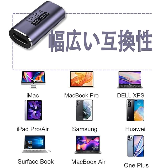 1.【USB Type C中継】USB Type C メス変換アダプタを使用すると、2本のUSB 4.0ケーブル(または2本のUSB 4.0デバイス、中継器の両端に接続された線伝送速度も40Gbpsの伝送速度に達しなければならない。)を簡単に接続して、延長ケーブルとして使用できます。USB3.0および1.1ポートとの下位互換性があります。デバイスのUSBインターフェースを効果的に保護し、長期間の使用によるUSBインターフェースの損傷しません。<br><br><br>2.【使用ご注意】本製品は一方向にしか使用できません。誤って挿入すると、充電やデータ伝送はできません。解決方法:USB C to USB C変換コネクタからUSBケーブルを抜き、プラグを180度回転させます。ご使用する前に、接続のケーブルはデータ伝送を支持するかどうかをご確認下さい。ケーブルはデータ伝送を支持しない場合、当商品を使ってもデータ伝送ができません。<br><br><br>3.【40Gbps高速伝送&5A高速充電】最新のType-C 3.2 技術により USB4.0 最大40GbpsのThunderbolt 4高速データ伝送(実際の転送速度は2.8GB/s実現と2.1GB/s書き込み)。このは、8K@60Hzまたは4Kディスプレイ2台を駆動するのに十分な帯域幅を有します。ファイル、ドキュメント、オーディオ、ビデオなどを数秒で高速に転送します。最大電流は5Aに達し、最大電力は100Wに達する可能性があります。注:1、40Gbpsは理論上の最大伝送速度です。実際の速度は、PC端末やケーブルなどの影響を受けので、実際の伝送速度を参照してください。<br><br><br>4.【幅広い互換性】このコネクタは、MacBook Pro、LG G5 V20、Samsung Galaxy S8、Galaxy S9(Plus)、Google Nexus 6P、GooglePixel、ChromeBook、Nintendo Switch、LG G5、LG G6、LG V20、Nexus 5X、Lumia 950、Lumia 950XL、Huawei p50、Huawei P9、新しいNokiaN1タブレットなどのさまざまな携帯電話やタブレットなどの接続をサポートしています。注意:magsafeと交換性がありません。もっと互換性の問題について、お問い合わせください。<br><br><br>5.【実用的で便利】軽量デザインなので出張、旅行、仕事にもピッタリ。コ便利な1個セットので、コンパクトな設計。車内、オフィス、家、更にお財布、カバンにも置いて分けて使えます。いつでもどこでもお持ちのタイプC設備に充電とデータの同期転送ができるUSB Cメス to USB Cメス 変換アダプタです。<br><br><br>