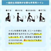 凝固剤不要|広げるだけですぐ使える 袋内に吸水シートを圧着済みなので、一般的な非常用トイレのように凝固剤を振りかける必要がありません。誰でも簡単に使え、慌ただしい災害時でも安心。