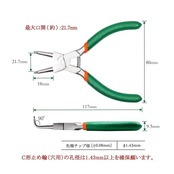 【用途】工作機械・電子機器等のC形止め輪(スナップリング)の着脱専用工具です。穴にスナップリングを取り付けるため、グリップを握ると閉じるプライヤーです。