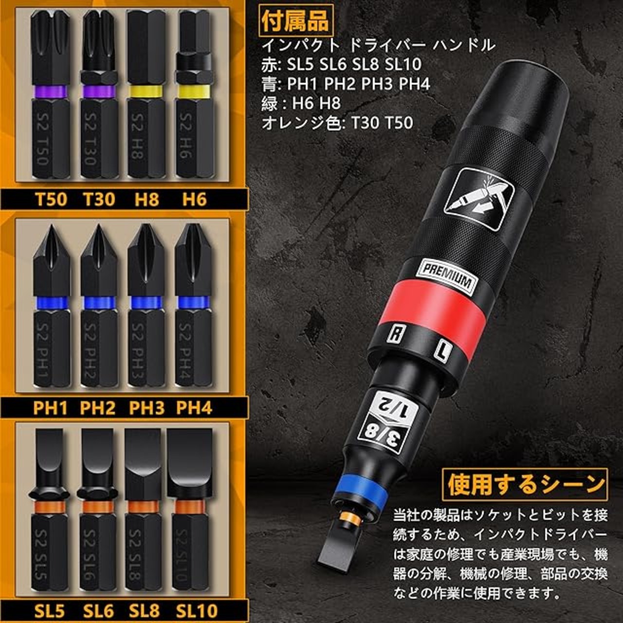 <b>【商品内容】</b><br> · S2鋼鍛造インパクトドリルビットは、高硬度、ノックに耐性があり、強い靭性、強い衝撃能力は、メンテナンス作業のための良いヘルパーです。<br> · ドライバーヘッドの表面は耐腐食性と防錆性に優れた黒色リン酸マンガンでコーティングされており、寿命が長くなります。また、仕様の区別を容易にするためにさまざまな色が用意されています。<br> · インパクトドライバーを組み立て、外したいネジに合わせてハンマーで本体を叩きます。打撃が強い回転力に変換され、固着したネジの取り外しが可能です。<br> ·質感のあるローレットハンドルのデザインで、滑り止め効果があり、ワークショップの作業者に適しています。<br> · 当社の製品はソケットとビットを接続するため、インパクトドライバーは家庭の修理でも産業現場でも、機器の分解、機械の修理、部品の交換などの作業に使用できます。<br> · 持ち運びが簡単: ドライバーセットはコンパクトで軽量であり、選べる多彩な仕様,持ち運びや収納が簡単です,すべてのビットは頑丈な製の収納ボックスにまとめられています。<br><br> <b>【付属品】</b><br> 1 x インパクト ドライバー ハンドル<br> 4 x マイナスドライバービット(オレンジ色): SL5 SL6 SL8 SL10<br> 4 x プラスドライバービット(青): PH1 PH2 PH3 PH4<br> 2 x 六角ドライバービット(黄色): H6 H8<br> 2 x トルクスドライバービット(紫) : T30 T50