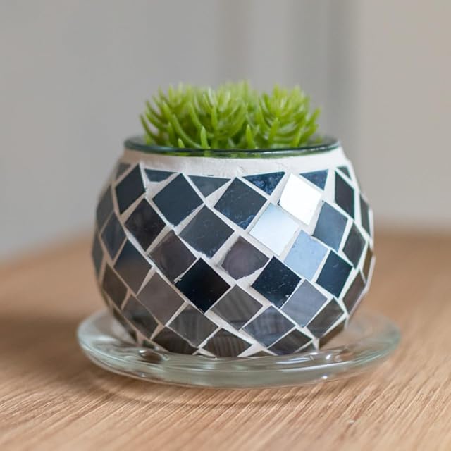 職人手作りのモザイクガラスがキラキラ輝く植木鉢は、色違いで複数並べて飾ってもずっと眺めていたくなる絵になるかわいさ。便利な水抜き穴と受け皿も付いています。