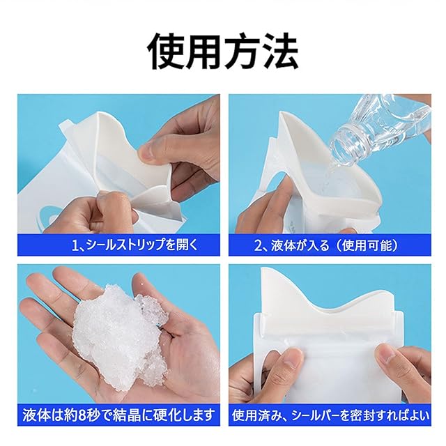 【男女老若兼用】老若男女、お子様にも、立ったままでも座った状態でも使用出来ます、使い方もとても簡単、用を足した後、密封ファスナーをしっかり閉じ、1‐2分でジェル状に固めます、逆にしても漏れる心配が有りません、臭いも防げます。