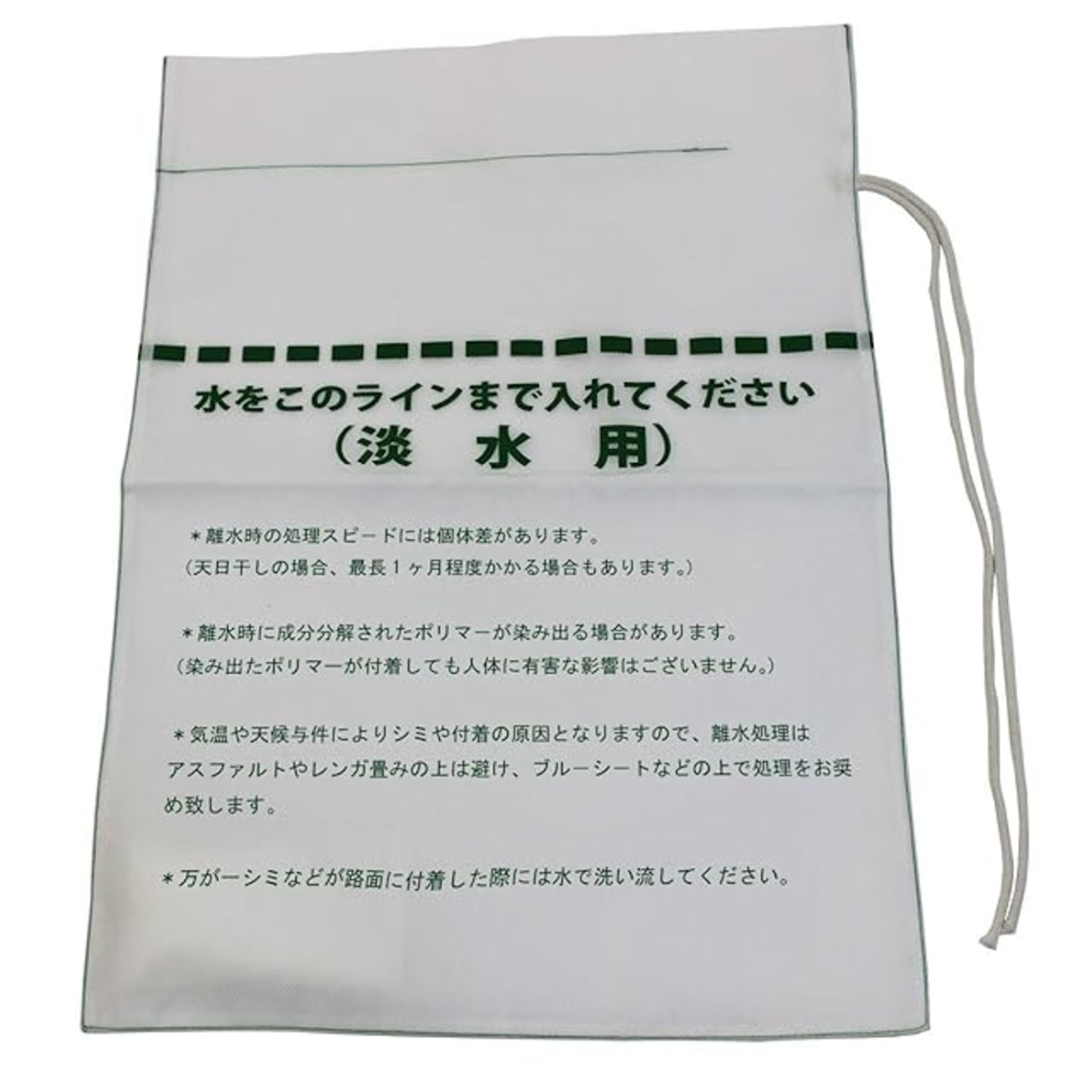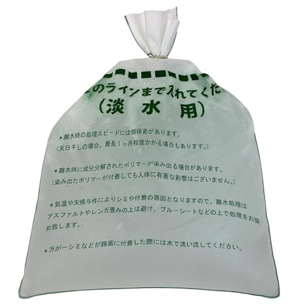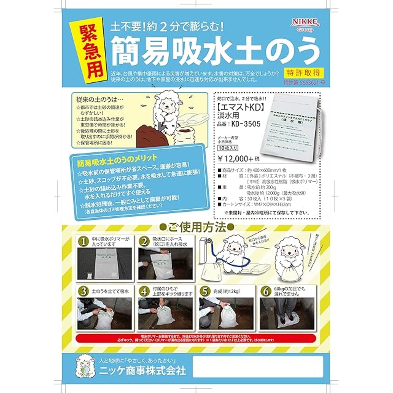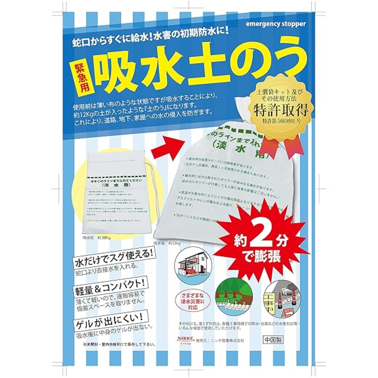 簡易吸水土のう(エマストKD 淡水用)10枚セット。約2分で膨張!土砂の調達が大変な市街地に最適な、水で作る土のう(水のう)です。使用前は薄い布のような状態で、保管場所が省スペースで運搬が容易。 吸水することにより、約12kgの土が入ったような『土のう』になります。スコップや土砂が必要なく、蛇口から直接吸水できるため、作業も簡単で、迅速に使えます。使用後は、脱水処理後、一般ごみとして廃棄が可能です。 5年間保存可能。特許取得 第5663691号 吸水ポリマーが膨張するまで、外袋より水が多少流れ落ちますのでご注意ください。 必ずきつく縛ってください。(ポリマーが漏れ出る原因になります)袋あたり水12リットル以上必要です。(多少前後します)