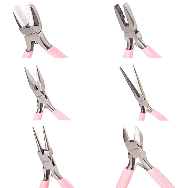 SUNNYCLUE 6本 ナイロンジョー プライヤー 平ヤットコ 平ペンチ ワイヤーループペンチ フラットノーズペンチ ニードルノーズプライヤー ロングノーズ ニッパー カットニッパー ペンチ カッター ラウンドノーズペンチ 丸ペンチ ラウンドプライヤー 極細 先細ペンチ ギザ付き 喰切 ピン曲げ ワイヤー マルカン ジャンプリング プライヤーセット アクセサリー用 製作 ジュエリーツール 炭素鋼 ピンク DIY手作り工具 クラフト道具