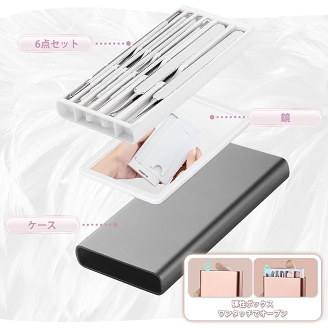 選べる6本のツール<br> 6本のアクネプッシャーで、お肌の状態や用途に合わせて使い分け可能!<br> ピンセットや圧出ループでニキビや老廃物を押し出す・摘まむ・掻き出すなどが可能<br> <br> さらに、器具を清潔に保管するための専用のケースも付属!<br> ・ニキビを自分でつぶしてしまう方<br> ・繰り返すニキビにお悩みの方<br> ・ニキビ跡を残したくない方<br> ・自宅で気軽にニキビケアをしたい方<br> などにオススメです。