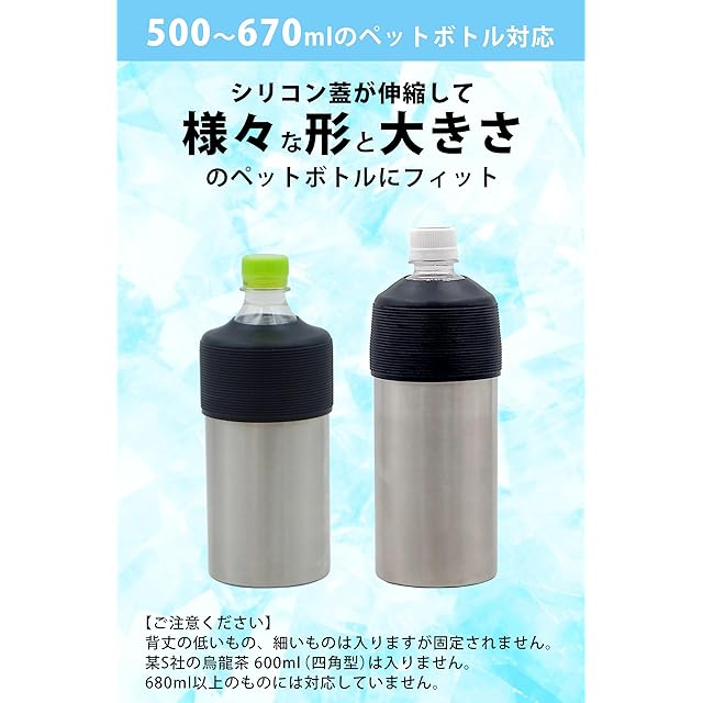 対応ペットボトル:500~670ml 角型ペットボトルにも対応!※背丈の低いもの、細いものは入りますが固定されません。某S社の烏龍茶 600ml(四角型)は入りません。680ml以上のものには対応していません。