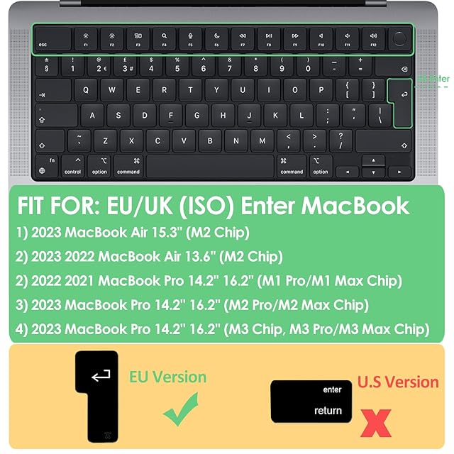 [√] 対応--EU/UKキーボードレイアウト(ISOバージョン)のみ:2024 2023 MacBook Air 15インチM3 M2チップ(A2941)、2024 2023 2022 MacBook Air 13.6インチ、M3 M2チップ(A2681)、2023-2023 MacBook Pro 1 x 4.2インチ M3チップとM3 M2 M1 Pro / マックスチップ(A2918/A2992/A2779/A2442)と2023-2021 MacBook Pro 16.2インチ(モデル:A2991/A2780/A2485)M3 M2 M1付き プロ/マックスチップ。