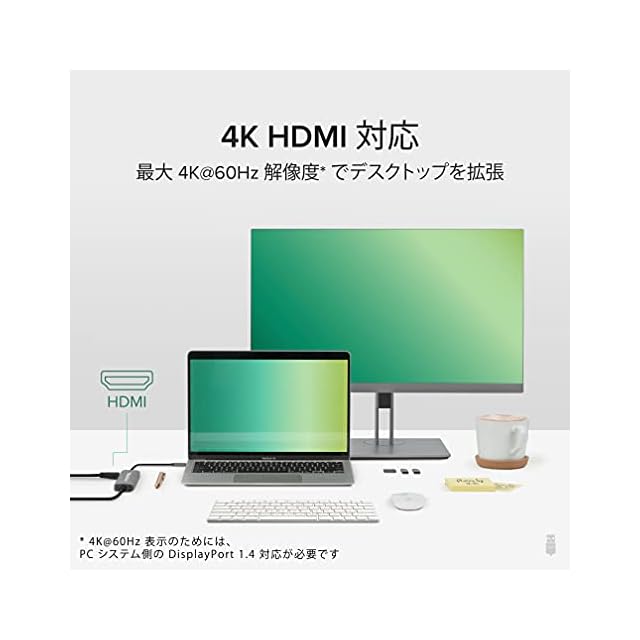 4K HDMI モニター対応 - 最大解像度 4K@60Hz 対応 HDMI ポートに、1 台の外部モニタを接続することができます。持ち運びにも便利なこのコンパクトなハブで、オフィスや家庭で簡単に外部モニタを接続でき拡張された画面領域で作業をすることができます。