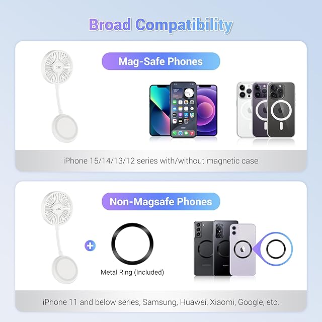 JJC マグネット式 スマホ 扇風機 Magsafe対応 ハンズフリー ハンディファン 携帯扇風機 USB充電式 超軽量 iPhone 16 15 14 13 pro max plus に適用 角度に調節可能・3段階風量調節 スマホホルダー スマホリング スポーツ観戦/通勤/通学/オフィス/花火大会/山登り/旅行用 暑さ対策 | SMILE