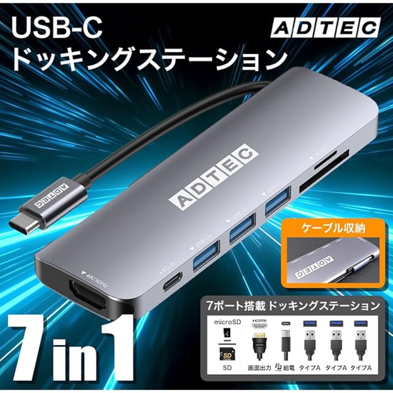 アドテック 7-in-1 USB-C HUB ドッキングステーション パススルー対応 5Gbps 4K/60Hz USB-A 3ポート 高速カードリーダーmicroSD/SD AHUB-VCA3P-4K30