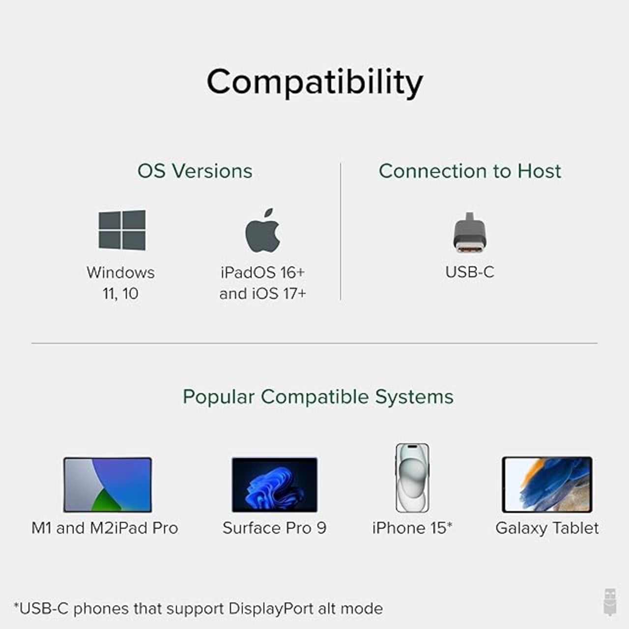 互換性 - このハブは Microsoft Surface Pro 9、Windows 10 以降のタブレット、M1/M2 チップ搭載で iPadOS 16.1 以上が導入された iPad などで使用できます。Samsung Galaxy S シリーズのような、DisplayPort 代替モードに対応している USB-C ポート付きの一部のスマートフォンでも使用できます。ただし USB-C ポート付きの多くの Android スマートフォンは、この DP 代替モードに対応していないことがあります。当ハブを使用する前に、スマートフォンの技術仕様をご確認ください。