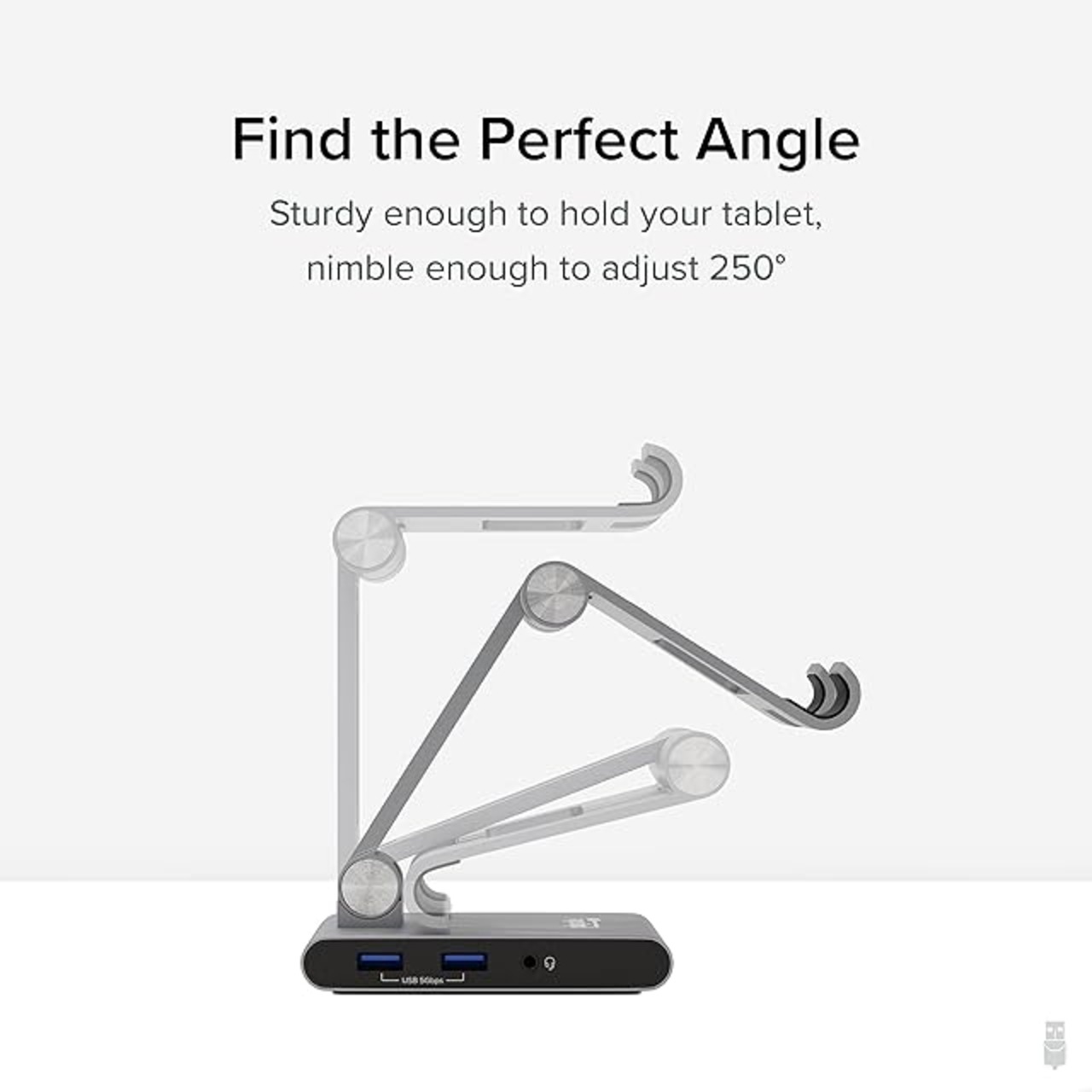この Plugable USB-C ハブ、タブレット・スマートフォン用スタンド型(UDS-7IN1)を使うと、様々なモバイル機器に追加のポートや電源を提供し、PC のように使用できるようになります。Windows タブレット、M1 / M2 iPad(Air または Pro)、DeX をサポートする Samsung Galaxy デバイスなど、DisplayPort 代替モードをサポートする USB-C ポートが搭載されたスマートフォンおよびタブレットで使用できます。モバイル機器で実際の作業をするときには、スマホやタブレット上をタップしたりズームしたりするだけでは限界があることがあります。こんなときは外部モニタを接続してみましょう。このハブにある HDMI ポートは、4K@30Hz 解像度までのモニタに対応しており、1080p@60Hz、2560x1440@60Hz などの外部モニタを接続できます。外部モニタに表示されたモバイル機器のコンテンツは非常に魅力的ですが、もしこれ以外に外部キーボードとマウスを接続したらどうでしょうか。充分に仕事に使用できる環境が出来上がります。このハブには、4K@30Hz までに対応した HDMI ポートに加え、USB 3.0(5Gbps)が 2 つ、100W(91W 出力)対応のパススルー PD 充電ポート、SD/MicroSD リーダー、音声入出力ポートが搭載されています。USB 3.0 には、キーボードやマウスなど、PC 用のデバイスを接続できます。さらに、本体とスマホやタブレット用のスタンドが一体化しているので大変便利です。iPad Pro 12.9 などを立ててもしっかりと自立するような重量を備えています。その質感はヒンジ部にも受け継がれています。 画面をタップしているときでもしっかり固定できる十分な張力があり、スタンドの角度を調整したときの心地よいスライドに驚くかもしれません。また、UDS-7IN1 は折りたたむとフラットになるので、バッグの中に入れて持ち運ぶことも可能です。