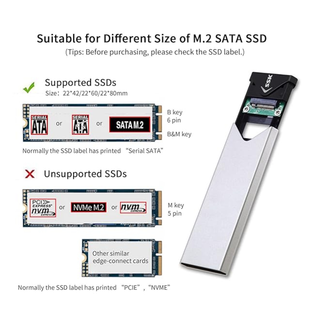 SSK アルミニウム USB 3.2 Gen 1 M.2 SATA SSDエンクロージャアダプター、外部NGFFベースのM.2ソリッドステートドライブエンクロージャリーダー、SATA SSD専用