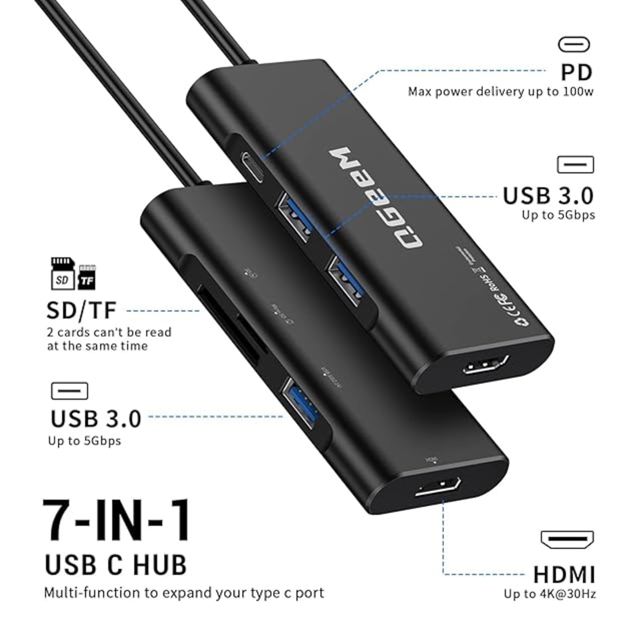 QGeeM Smart USB Cハブ:プラグアンドプレイ、ドライバー不要、4K@30Hz HDMI、SD/TFカード接続、USB 3.0 x3データポート、100Wの電力供給による高速パススルー充電を備えたノートパソコンのUSB-Cポートをさらに活用。このUSB C - HDMIハブは、必要なすべての機能を完璧に組み合わせ、デスクスペースを節約し、デバイスの接続性を拡張します。