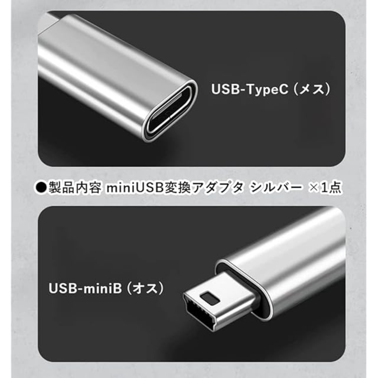 USB2.0 USB-miniB (オス) - USB-TypeC (メス) 変換アダプタ<br />充電転送対応変換コネクタ※充電転送対応USBケーブルをお使い下さい<br />●製品内容 miniUSB変換アダプタ シルバー ×1点<br />●保証期間 お届け日より1ヶ月