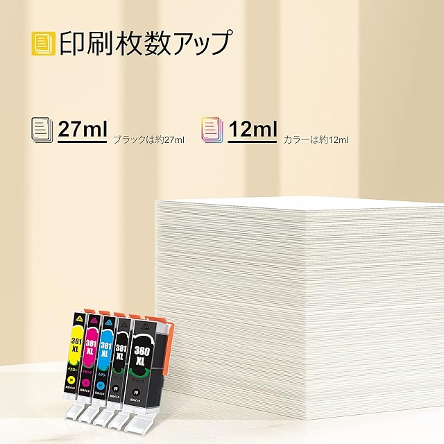 【サイズ】ブラック ( BCI-380XL )は約27ml、カラ ( BCI-381XL BK / BCI-381XL C / BCI-381XL M / BCI-381XL Y )は約12ml。
