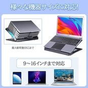 冷却パッドは人間工学に基づいた設計で、6段階の角度調整が可能です。パソコン用スタンドとしても使用でき、0°から30°までの角度で調整が可能です。この設計により、長時間作業しても首や頭の疲れを軽減し、快適な姿勢を保つことができます。 サイズは368*273*28mmであり 10〜16インチの様々なノートパソコンに対応可能です。2kg以上のノートパソコンでもしっかりと安定します。さらに、スリップ防止ゴムが付いており、ノートパソコンの滑り落ちや揺れを効果的に防ぎます。 画面の高さを調整できるため、正しい姿勢で作業ができ、肩や首の負担を軽減し、目の疲れを防ぎます。デスクワークが快適になるため、外出自粛期間でもストレスを減らせます!