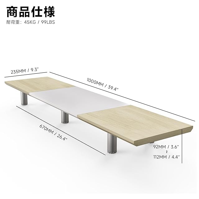【商品仕様&12か月品質保証付き】PC台の天板:1000*235MM,厚さ18MM;高さ調整92MM-112MM 本体重量:約2.8kg 最大耐荷重:45kg 組み立て式。保証期間内に、取り扱い説明書に準じた使用状態で故障や不具合が生じた場合は当社の判断により交換させていただきます。