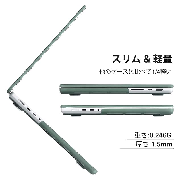 透明で薄型の保護ケース:このケースは 2024年発売 MacBook Pro 14インチ M4、M4 Pro、M4 Max(モデル番号:A3401 A3112 A3185); 2023年発売MacBook 14インチM3、M3 Pro、Maxチップ(モデル番号:A2918 A2992 A2779 A2442)専用です。軽量: 220g; 厚さ: 1.5MM。高品質なポリカーボネート素材を使用しており、傷や凹み、日常的な摩耗からノートパソコンを保護し、再販時の価値を守ります