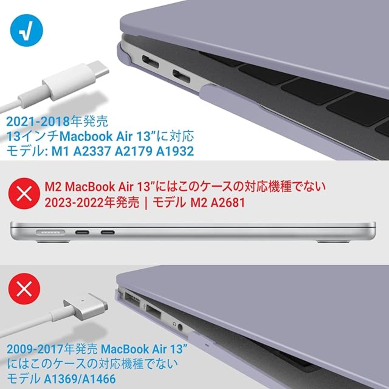 ❺【ご注意】2018年以前に発売された旧型のMacBook Air(モデル: A1466/A1369)にはこのケースの対応機種でない*機種によりデザイン縮尺が若干異なります。ご利用のMacBookが対応モデルである事を再度確認ください。
