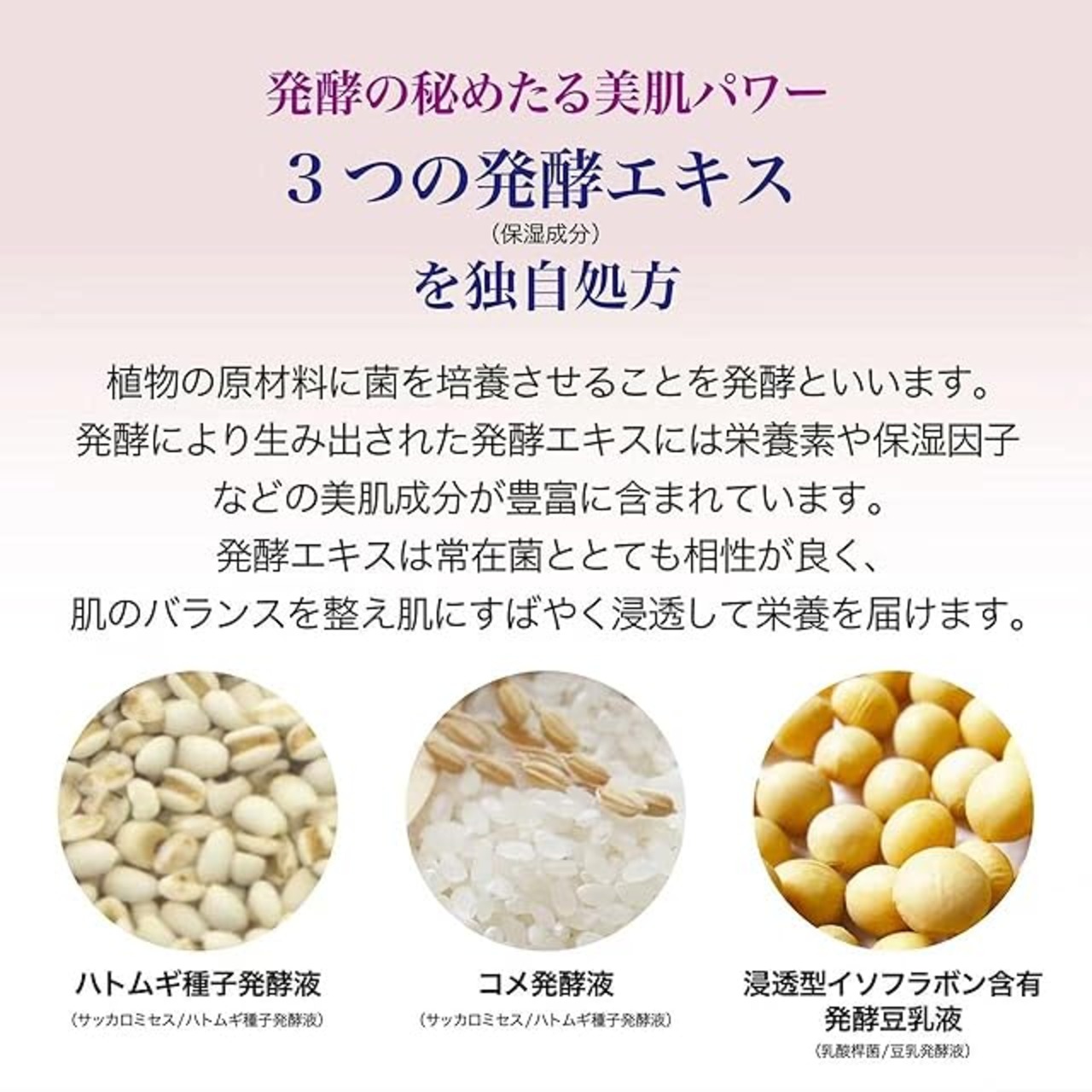 「3つの発酵エキス*1独自処方、発酵の秘めたる美肌パワー 」発酵エキスは常在菌ととても相性がよく、肌のバランスを整え、肌に素早く浸透して栄養をお届けします。また、スクワラン(エモリエント剤)を配合されているため、乾燥や肌荒れなどを予防することにより、透き通るような美肌へ導きます。うるおいを逃がすことなく閉じ込めるリッチな潤浸保湿クリームです。毎日しっとりもちもち肌へ! *1サッカロミセス/ハトムギ種子発酵液、コメ発酵液、乳酸桿菌/豆乳発酵液
