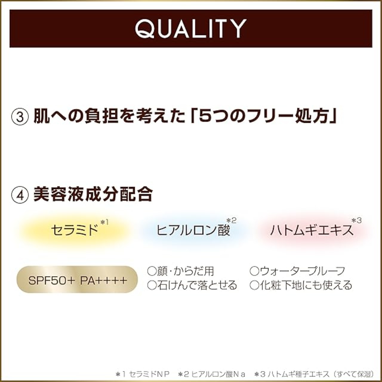 ①ベタつきのなさを追求した「スキンタッチ処方」。 伸びが良く瞬時に肌と一体化。薄膜タッチのみずみずしいテクスチャーで、驚くほど軽い付け心地にこだわりました。 ②夏を彩る2種類の香り ボディフレグランスのように、ついまといたくなるようなやわらかな香り。 ③肌への負担を考えた「4つ※1のフリー処方」。 ④美容液成分配合。セラミド※2、ヒアルロン酸※3、ハトムギエキス※4 ※1 着色料、鉱物油、界面活性剤、パラベン ※2 セラミドNa、※3 ヒアルロン酸Na、※4 ハトムギ種子エキス(すべて保湿)