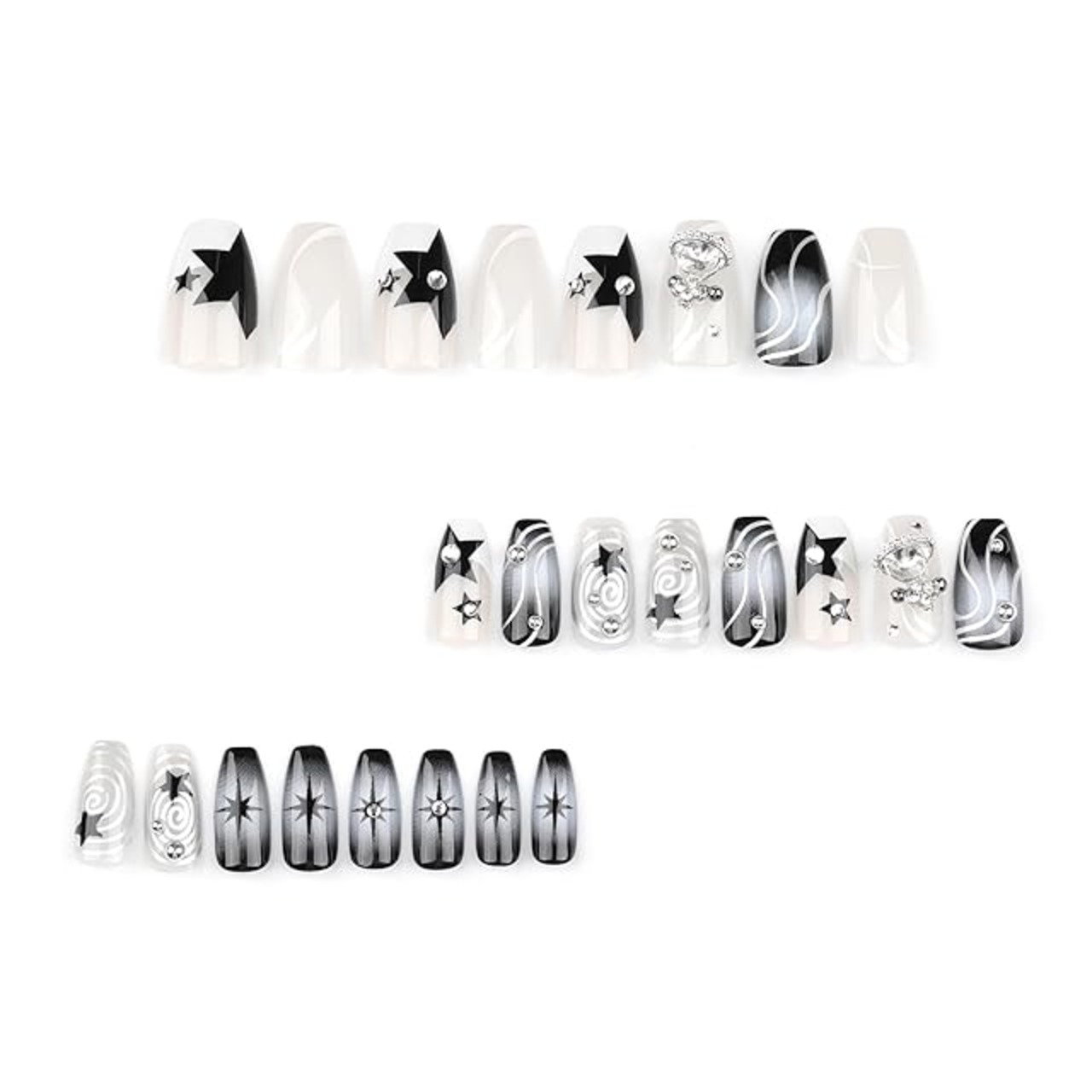 ネイルチップ 地雷系 黒系 つけ爪 ネイルチップ おしゃれネイルチップ 3d立体リボン ダイヤ 韓国 手作り 量産型 かっこいい 系 星 蝶々 花柄 簡単オフネイル イベート コスプレネイル ネイルアート 24枚入 おしゃれ 人気 女性 プレゼント セルフネイル初心者 貼り付けるテープ 48個付属 (星, Free size)