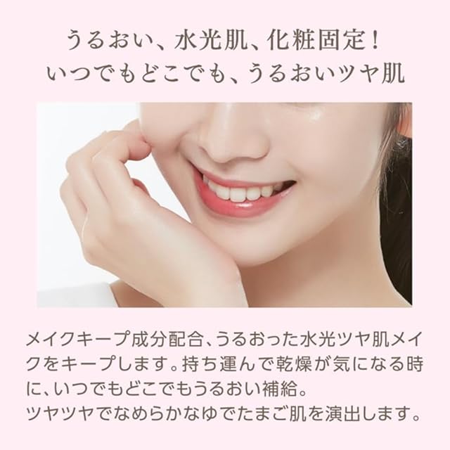 【うるおい、水光肌、化粧固定】 メイクキープ成分配合。 メイクをふんわりうるおい固定し、水光ツヤ肌をキープします。