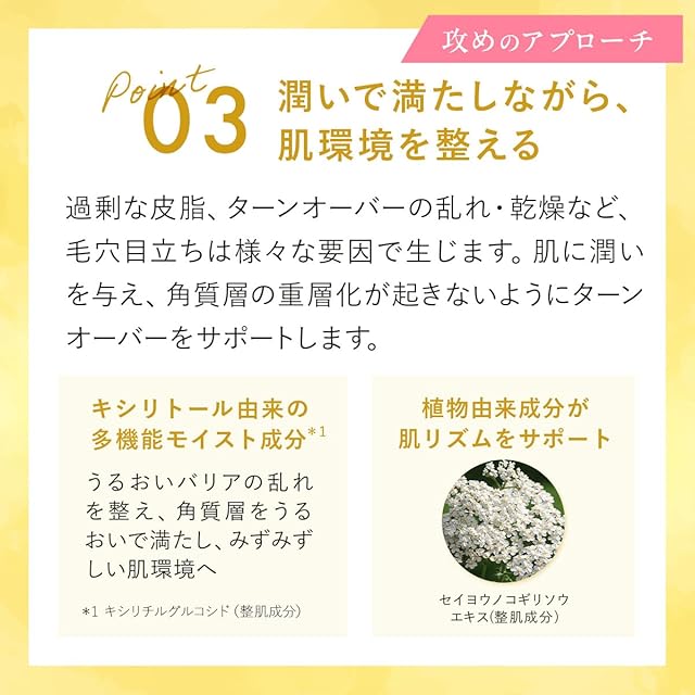 【肌をうるおいで満たし 肌バリアをサポート】乾燥による肌バリアの乱れが、毛穴を目立たせる要因となることに着目し、キシリトール由来の多機能モイスト成分*1を配合。うるおいに満ちる肌環境に整え、肌バリアをサポート。しっとりとキメの整った、健やかな肌へ導きます。 *1 キシリチルグルコシド(整肌成分)
