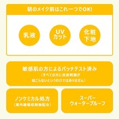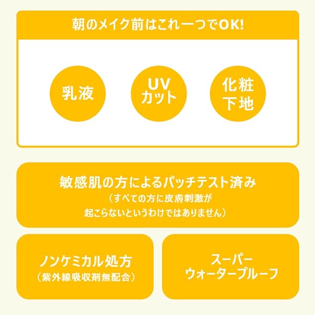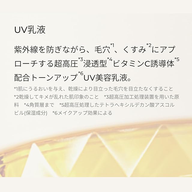 SPF50+・PA++++ 敏感肌※1もぷるんとうるおい、シミを防ぐトーンアップUV美容乳液。 敏感肌※1も使えるノンケミカル処方※2で国内最高水準のUVカットを両立。 超高圧※3浸透型※4ビタミンC誘導体※5配合でUVケアしながら毛穴※6・くすみ※7にアプローチ。 乾燥によるくすみにうるおいを与えナチュラルにトーンアップし、日焼けを防いで透明感※8のあるツヤっと明るい肌に整えます。 自然なツヤ肌を演出する「トーンアップクリア※8」 ※1敏感肌の方によるパッチテスト済み(全ての方に皮膚刺激がおこらないというわけではありません) ※2紫外線吸収剤無配合 ※3超高圧加工処理装置を用いた原料 ※4角質層まで ※5超高圧処理したテトラヘキシルデカン酸アスコルビル(保湿成分) ※6肌にうるおいを与え、乾燥により目立った毛穴を目立たなくすること ※7乾燥してキメが乱れた肌 ※8メイクアップ効果による 【ご使用方法】 ●よく振ってからお使いください。●適量を手に取り、お肌にムラなくのばしてください。量が少ないと、充分な日焼け止め効果が得られません。●汗をかいたり、タオルで拭いた後などは必要に応じて塗りなおしてください。 ●化粧下地としてもお使いいただけます。●落とすときには、メイク落としをご使用ください。