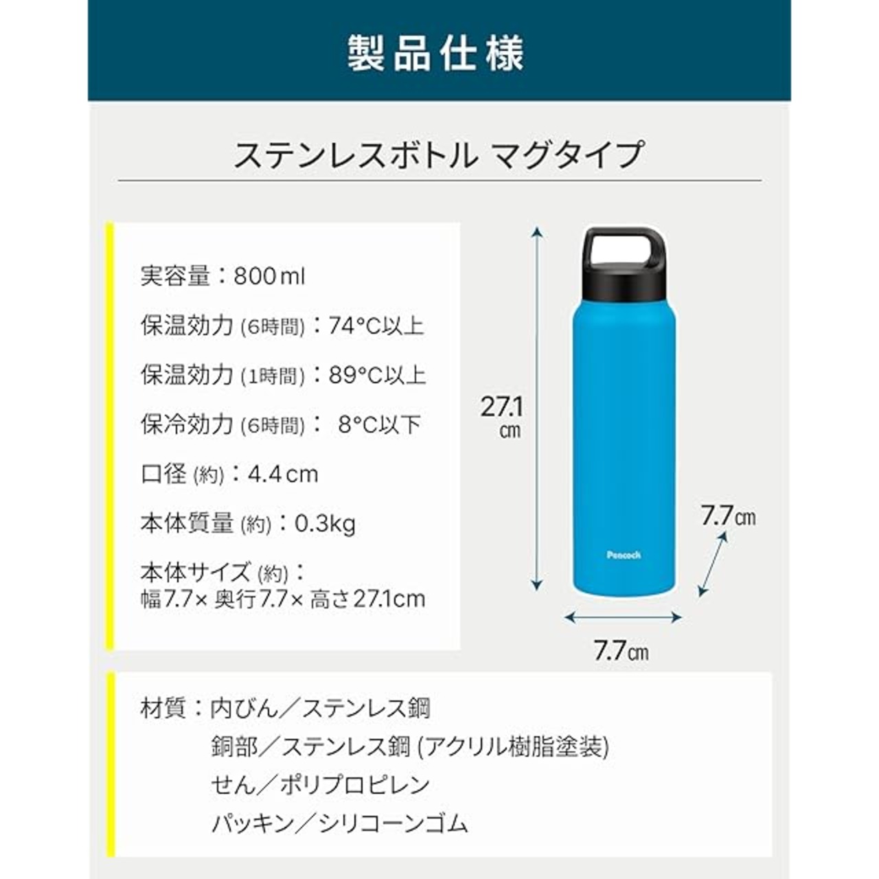 ピーコック水筒 800ml 保温 保冷 ハンドル付き マグボトル スポーツドリンク対応 0.8l ブルー AKR-80 A