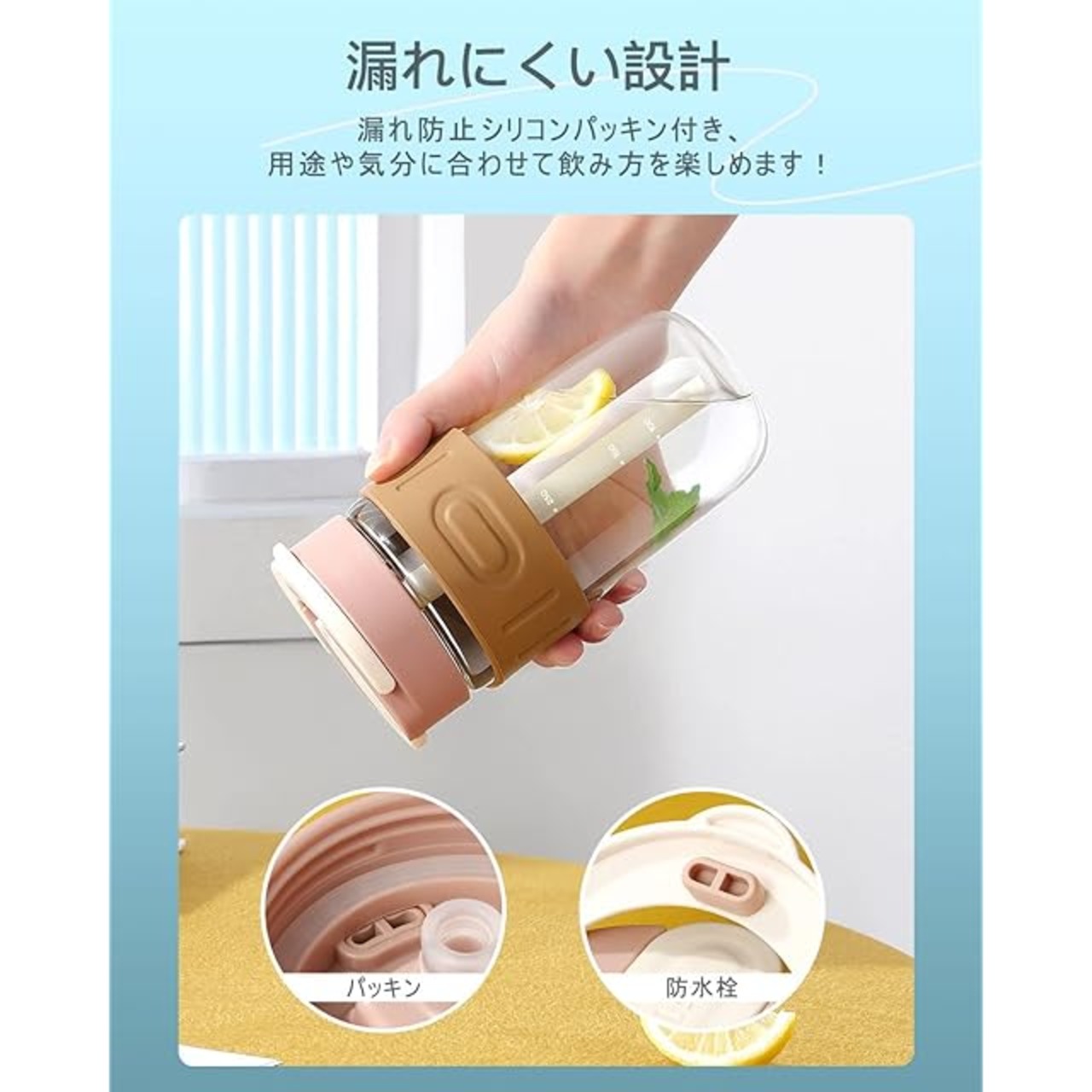 【漏れ防止設計】水筒のシリコンストローはポップアップする仕組みとなっており、内側に折り畳まれています。直接飲む際の飲み口に漏れ防止のシリコンパッキンがあるため、密閉状態となり、振っても漏れない仕組みになっています。水筒本体には取り外し可能な滑り止め&やけど防止のシリコンスリーブがあり、持ちやすく、耐熱性もあり、簡単なお手入れが可能となっています。(注意:漏れ防止機能が損なわれる可能性があるため、シリコンパッキンは取り外さないでください。高温飲料の場合は、やけどをする恐れがありますので、シリコン部分を持ち、ガラス部分に触れないでください。)