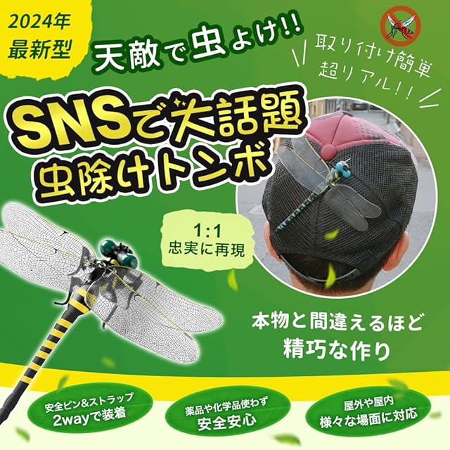 【天然で無害な虫よけ対策】人体にマイナスの影響を与える殺虫剤・防虫剤などを使わず、自然の摂理に沿った方法で、日常生活を脅かす蚊・蝿などの害虫を天敵であるトンボの模型で威嚇・駆除ができます。自然環境や人体の健康にやさしい虫よけグッズになります。